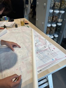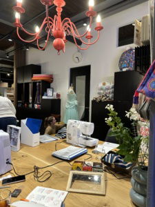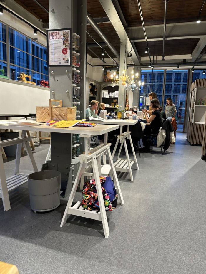 Atelier Kleurstof biedt een inspirerende grote ruimte met naai- en lockmachines, stoomstrijkijzer, hoge kniptafels, patroonbladen, patroonpapier en een gezellige stamtafel met koffie en thee. Gebruik is allemaal inbegrepen in de prijs.